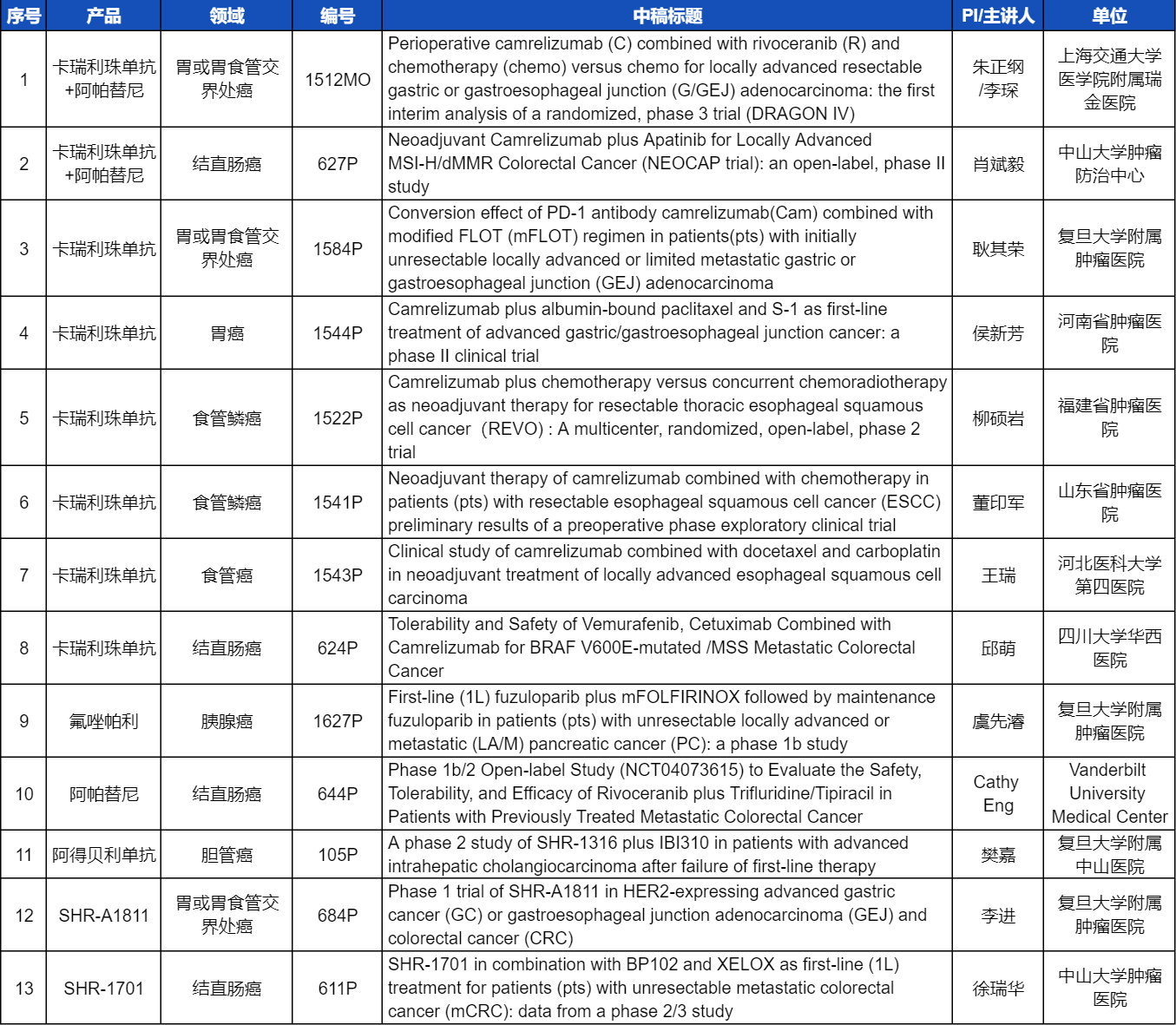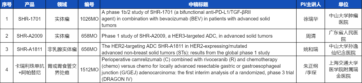 本次ESMO大会,将由中山大学肿瘤医院徐瑞华教授、广东省人民医院周清教授、中山大学孙逸仙纪念医院姚和瑞教授、上海交通大学医学院附属瑞金医院李琛教授分别就4项ag真人国际官网医药创新产品相关研究做口头报告,包括SHR-1701、SHR-A2009、SHR-A1811这3款未上市创新产品的实体瘤治疗临床研究,以及1项“双艾”组合(卡瑞利珠单抗联合阿帕替尼)治疗局部晚期可切除胃/胃食管交界处癌的Ⅲ期临床试验期中分析。