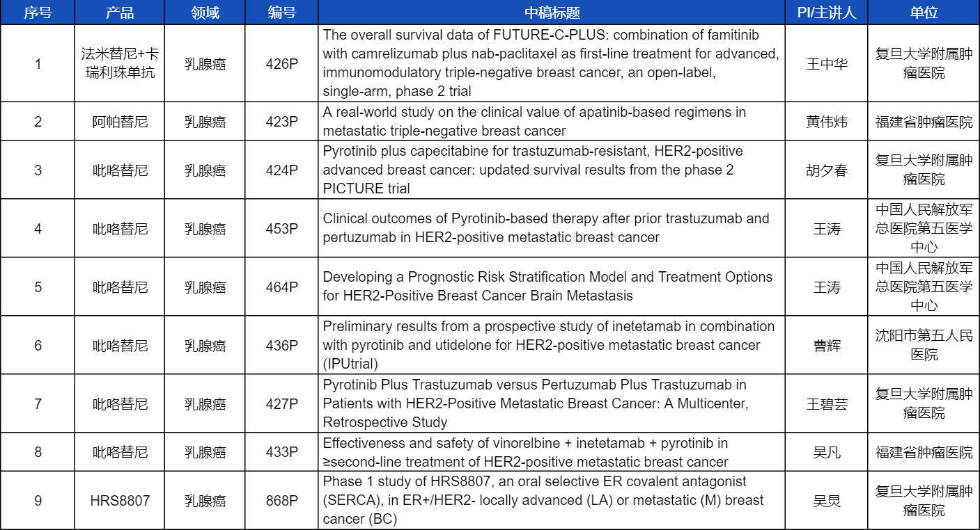 在乳腺癌领域,吡咯替尼、阿帕替尼、卡瑞利珠单抗、法米替尼,或产品间联合或联合化疗,共有9项研究入选壁报讨论,其中吡咯替尼占据6项,较为全面地展示了这款中国首个自主研发抗HER2靶向药在乳腺癌治疗中的显著特点和潜力。此外,ag真人国际官网医药自主研发的新型选择性雌激素受体共价拮抗剂(SERCA)HRS8807治疗ER+/HER2-局部晚期或转移性乳腺癌的Ⅰ期研究也成功入选,有望为此类患者带来更多用药新选择。