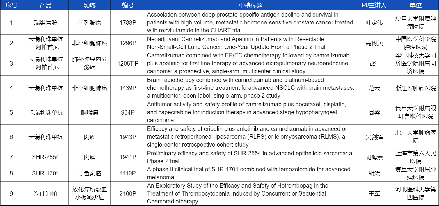 在非小细胞肺癌、咽喉癌、肉瘤、前列腺癌、黑色素瘤等多个领域,卡瑞利珠单抗、阿帕替尼、瑞维鲁胺、SHR-1701、SHR2554等创新产品相关研究一共入选了8项壁报展示。此外,ag真人国际官网医药自主研发的血小板生成素受体激动剂(TPO-RA)海曲泊帕在放化疗所致血小板减少领域的探索性研究显示良好的疗效,入选壁报展示。